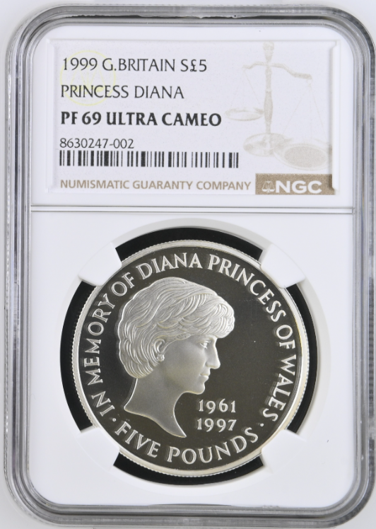 NGC鑑定済み、PF69 ULTRA CAMEO 1999年発行のダイアナ元妃追悼 5ポンド銀貨です。